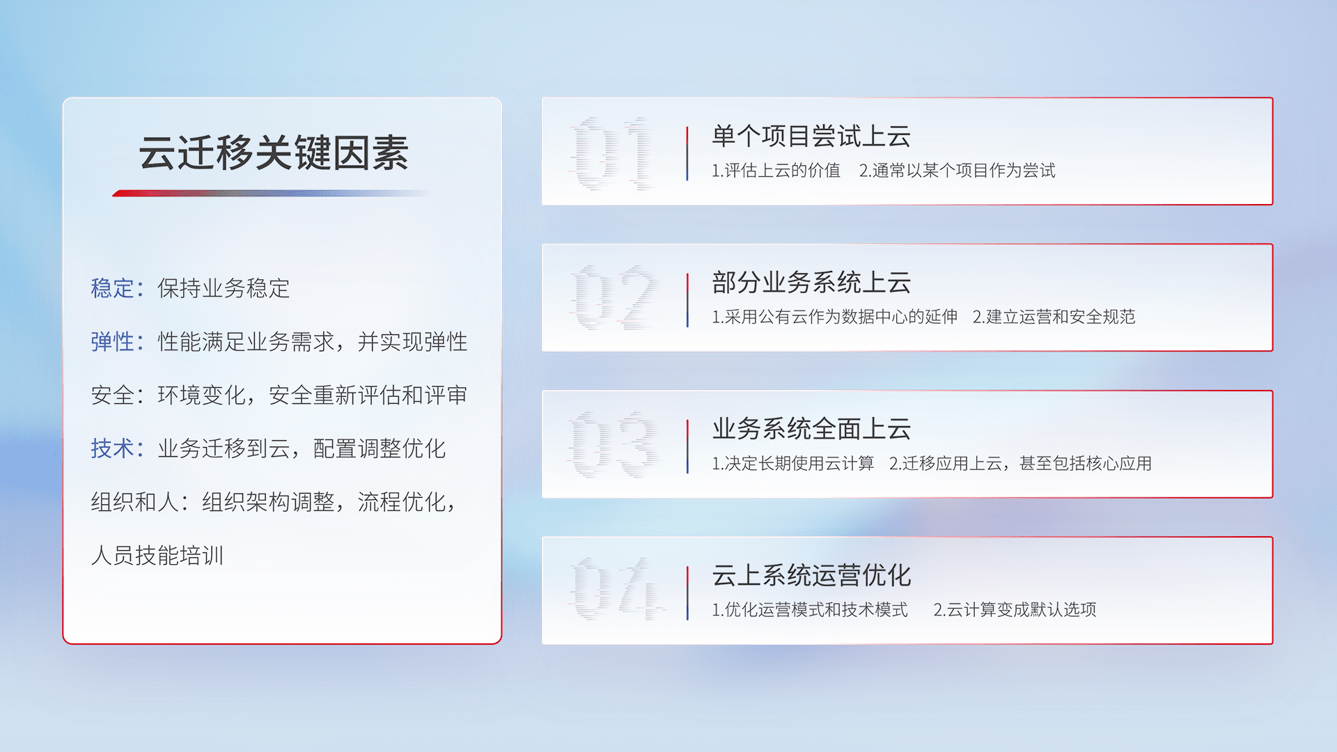结合实际业务,,,从规划设计、、云平台选型、、、、云原生改造、、数据迁移、、、集成交付,,迁移全过程为客户识别最佳上云路径,,做好风险识别管理,,设计网络架构、、身份权限、、安全审计合规、、、操作审计、、、日志审计、、、、监控告警策略、、多站点容灾设计等,,对云上基础设施进行整体规划,,,,提升IT治理水平,,,以满足弹性、、高可用、、、高性能的需求。。