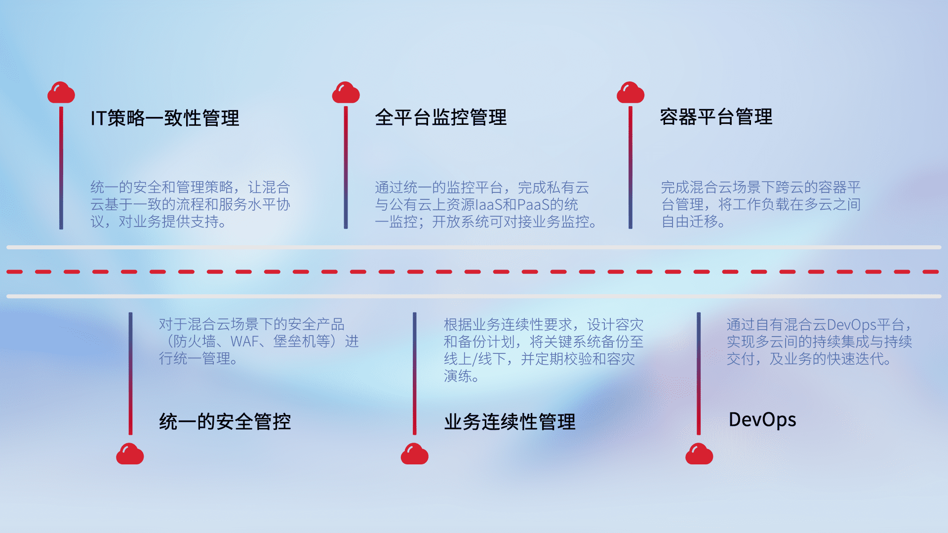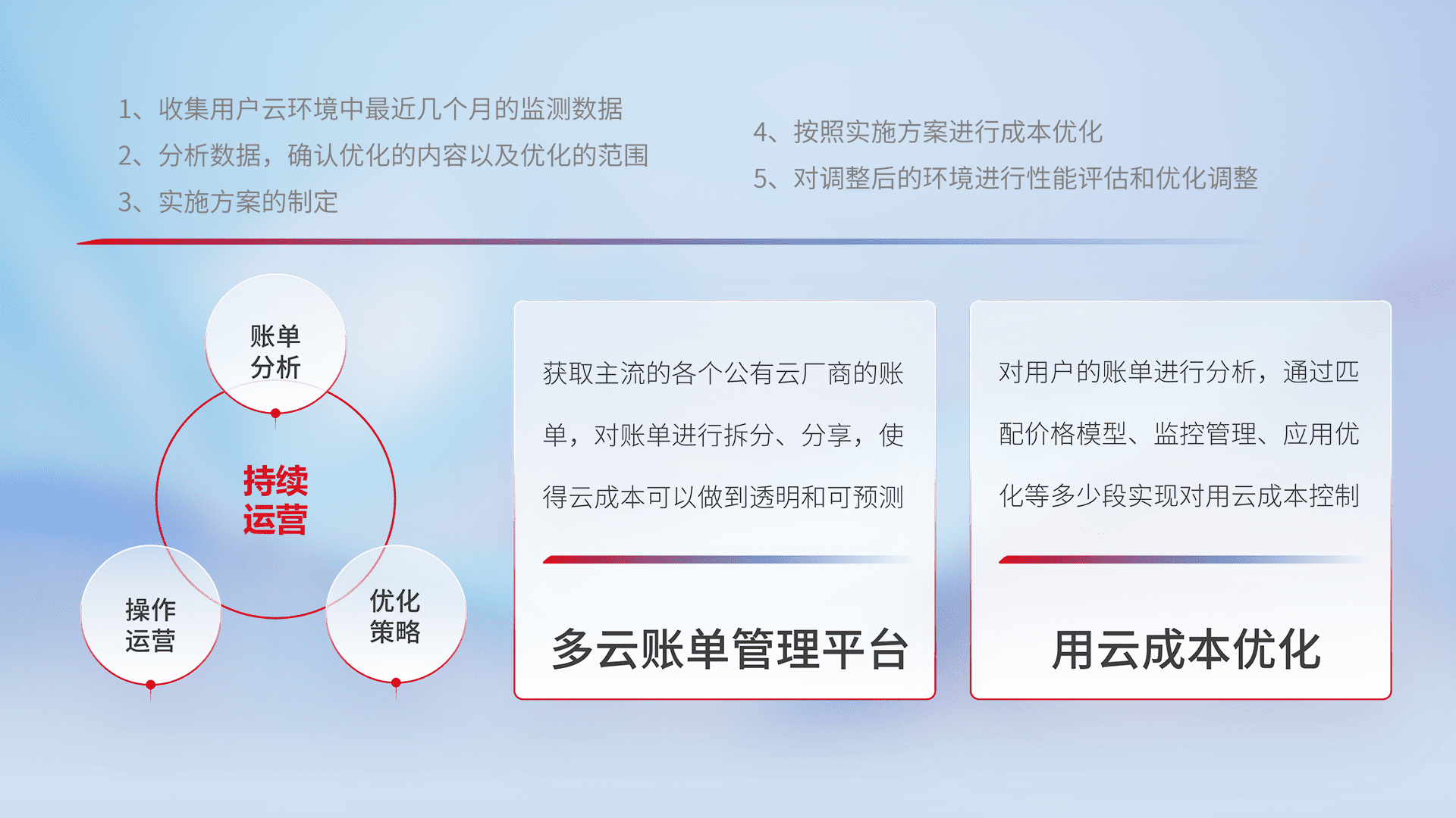 通过多云纳管,,,以统一的资源数据模型把客户的云资源进行抽象和封装,,,进而实现对多云资源的统一操作,,,,保障云资源管理的可靠性、、、稳定性与可用性。。。。量身定制化运维内容,,,配置、、、开发运维、、、补丁管理、、、备份、、、监控、、、认证和访问管理、、审计和日常巡检等,,,,保障在用云过程中的可靠度,,稳定度以及高可用率。。。。