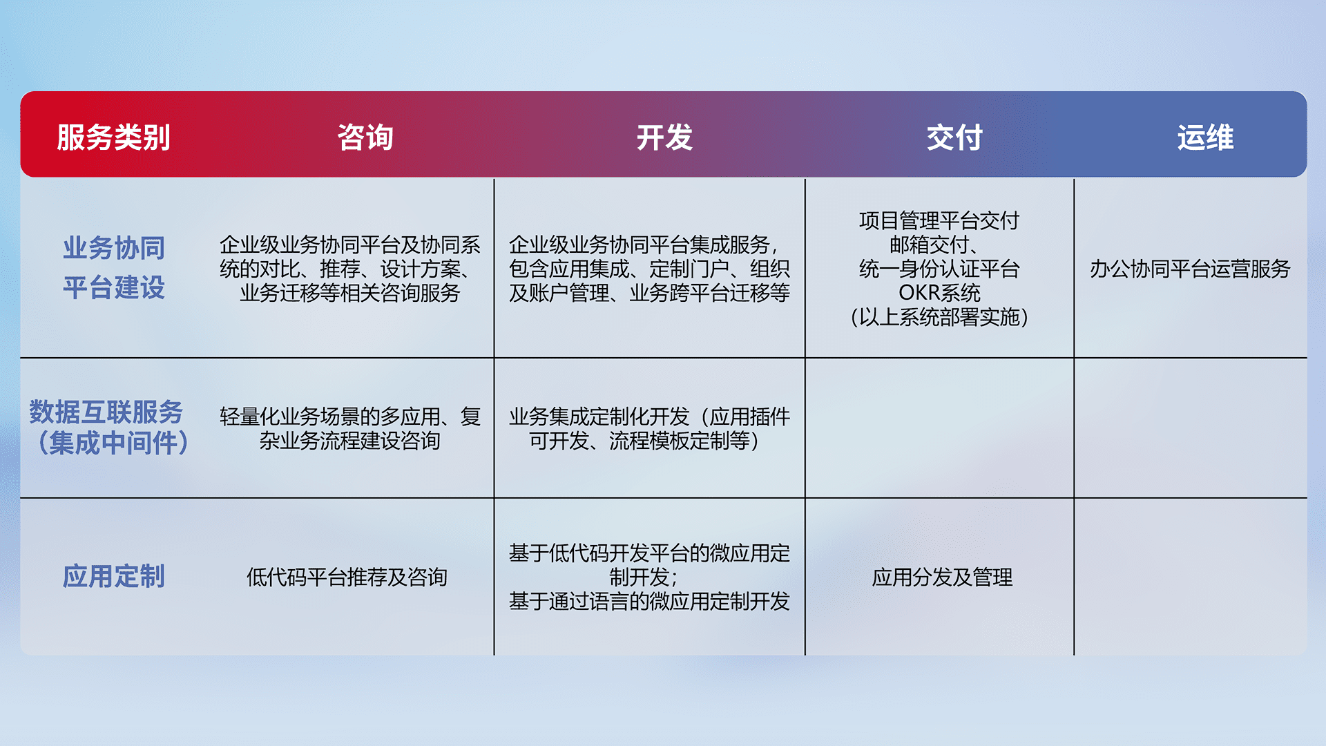 针对钉钉、、、、企微、、、、IDaas等平台级产品提供产品的规划、、、方案、、、交付、、定制化开发等服务,,,,实现如统一协同办公、、智能客户服务、、混合会议管理、、智能数据查询、、、等业务场景,,,实现数字化转型。。。。